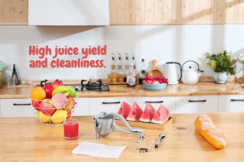 • BCOH Juice Squeezer Manual Juicer – Handheld Aluminium Alloy Juice Extractor with Food Tong Filter Bags And Fruit Peeler- Great Citrus Squeezer for Healthy Juicing, Cocktails, Cooking – Quick Press, Easy Grip Design , smash grapefruit, silver handy joie machine