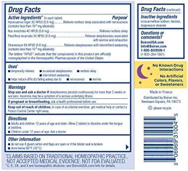 Boiron Sleep calm provides an over-the-counter solution to relieve occasional sleeplessness, restless sleep, and intermittent awakening. This homeopathic medicine calms restless sleep, so you can fall asleep and stay asleep without feeling groggy the next day. It’s made with plant-based active ingredients that help restore a natural sleep pattern disturbed by nervousness, worries, exhaustion, an overactive mind, Jet lag, or night shift work. The melt away tablets are convenient to take without water at bedtime, and can be taken on an empty stomach. Sleep calm is free of melatonin and other ingredients that cause daytime drowsiness. It’s non-habit forming so it won’t induce dependence and does not interact with other medications. There are no artificial colors, flavors, sweeteners, or preservatives. Recommended for everyone ages 12 and up, sleep calm is available over the counter in a box of 60 or 120 unflavored melt away tablets. Also try Sedalia for daytime symptoms of stress. Claims based on traditional homeopathic practice, not accepted medical evidence. Not FDA evaluated.