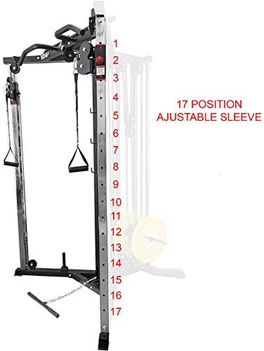 16 position adjustable sleeves so you can perform a wide range of exercises from different angles. With 3.5″ between each position and a 63″ range of adjustment, the pulley brace can be set to numerous positions for a wide variety of cable exercises.